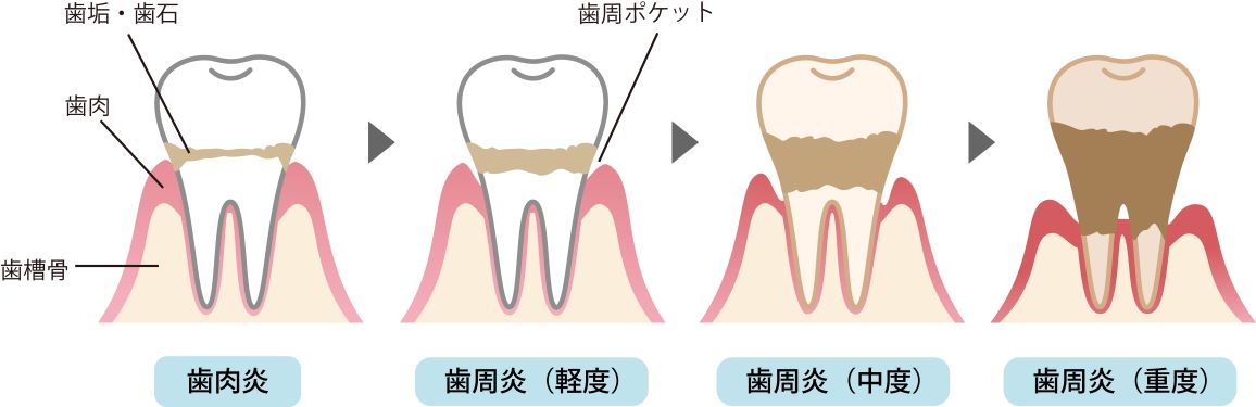 歯を支える骨や歯茎を歯周組織といいます。 細菌や嚙み合わせ等による歯周組織に破壊が起こったものを歯周病といいます。 歯周病細菌は歯肉に付着すると増殖しながら、歯垢(プラーク)を形成し、周り破壊し、より細菌が住みやすい環境を整えていきます。 歯周ポケットを底へ底へと進行し、歯茎の腫れや出血、歯がぐらぐら動くようになり、ひどい状態になると抜歯に至るケースもあります。 また、歯や口の中だけの問題ではなく、糖尿病や認知症など、全身の健康にまで悪影響をあたえる疾患です。 |