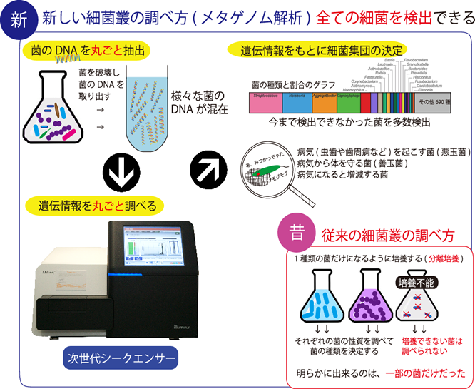 | 細菌検査 むし歯や歯周病は歯や歯周組織の細菌感染による疾患で、口腔と細菌の関係は切っても切れない関係にあります。 谷口歯科医院では、併設の口腔常在微生物叢解析センターで、さまざまな口腔微生物の検査、解析を行っています。 また、患者さんのお口から採取した生きた細菌をモニターで観察する位相差顕微鏡検査も行っております。 ●メタゲノム解析 5,6種類の特定の細菌しか検出できなかった昔の検査(リアルタイムPCR)と比較して メタゲノム解析100種を超える菌種とその割合新しい検査 |