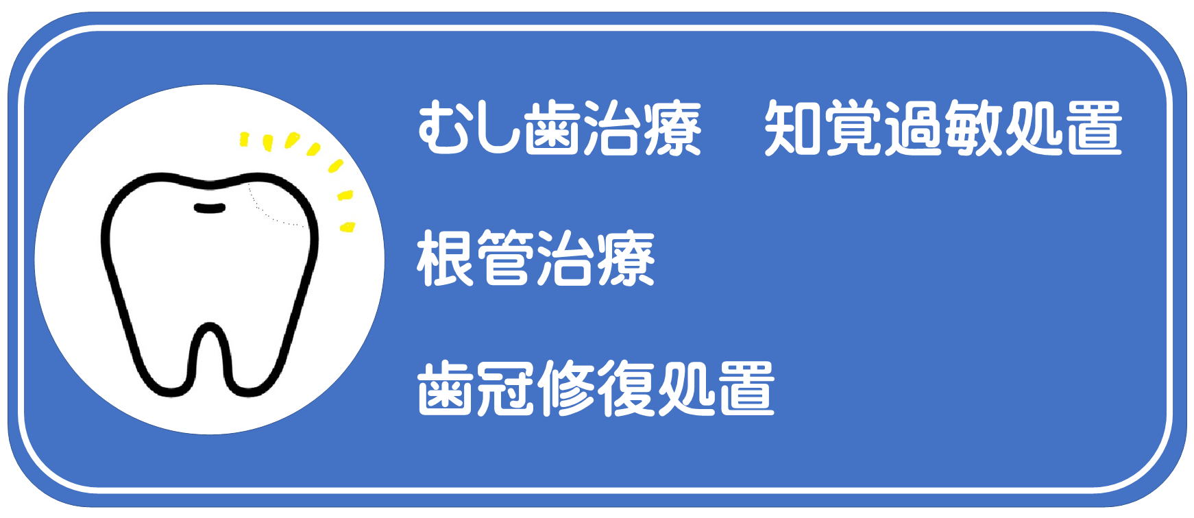 ●むし歯治療 (う蝕治療) 『歯が欠けた』『詰め物が外れた』『欠けたところが痛い』などの症状を治療します。 むし歯が深い場合は、むし歯の底の歯の表面を強化する薬を入れて様子をみるなど、なるべく神経を温存するように努めております。 また、歯の溝がむし歯になりそうな場合、予防として溝を塞ぐ治療やむし歯を予防するフッ素の塗布も行っております。 ●根管治療 むし歯が深く、どうしようもなく歯の神経を取る治療や歯の神経の管から根の先に感染を起こした歯の消毒を行う治療です。 必要に応じて、高精細なCT画像で診断し、Ni‐Tiロータリーファイルを用いて治療します。 症状によって、回数がかかることがあります。 ●知覚過敏処置 むし歯以外で、冷たい物や歯ブラシが当たって歯が凍みる『象牙質知覚過敏』と呼ばれる症状があります。 歯ぎしりや過度なブラッシング圧で、歯の表面の結晶が崩れ、そこを冷たいものが触れると、歯の神経が疼痛を覚える状態に陥ります。 通常、凍み止めの薬を歯面に塗布したり、凍み止めの成分を含む歯磨き粉を使用することで、症状が緩和されます。 しかし、知覚過敏自体が、歯の神経のSOSとして現れることがあり、神経を取らないと改善しない場合もあります。 ●歯冠修復処置 むし歯による欠損や歯の破折部などを修復する治療です。 軽度の場合、コンポジットレジン(CR)という歯の色と近似した樹脂を直接詰めます。 複雑な欠損の場合、型取りをして、後日装着するようになります。 欠損の大きさから部分的な詰め物(インレー)や歯の全体を覆う被せ物(クラウン)、歯の欠損部を補うブリッジで対応します。 保険適応の白い被せ物・詰め物を積極的に用いており、保険適応になったCADCAMインレー・クラウンでの修復も行っております。 |