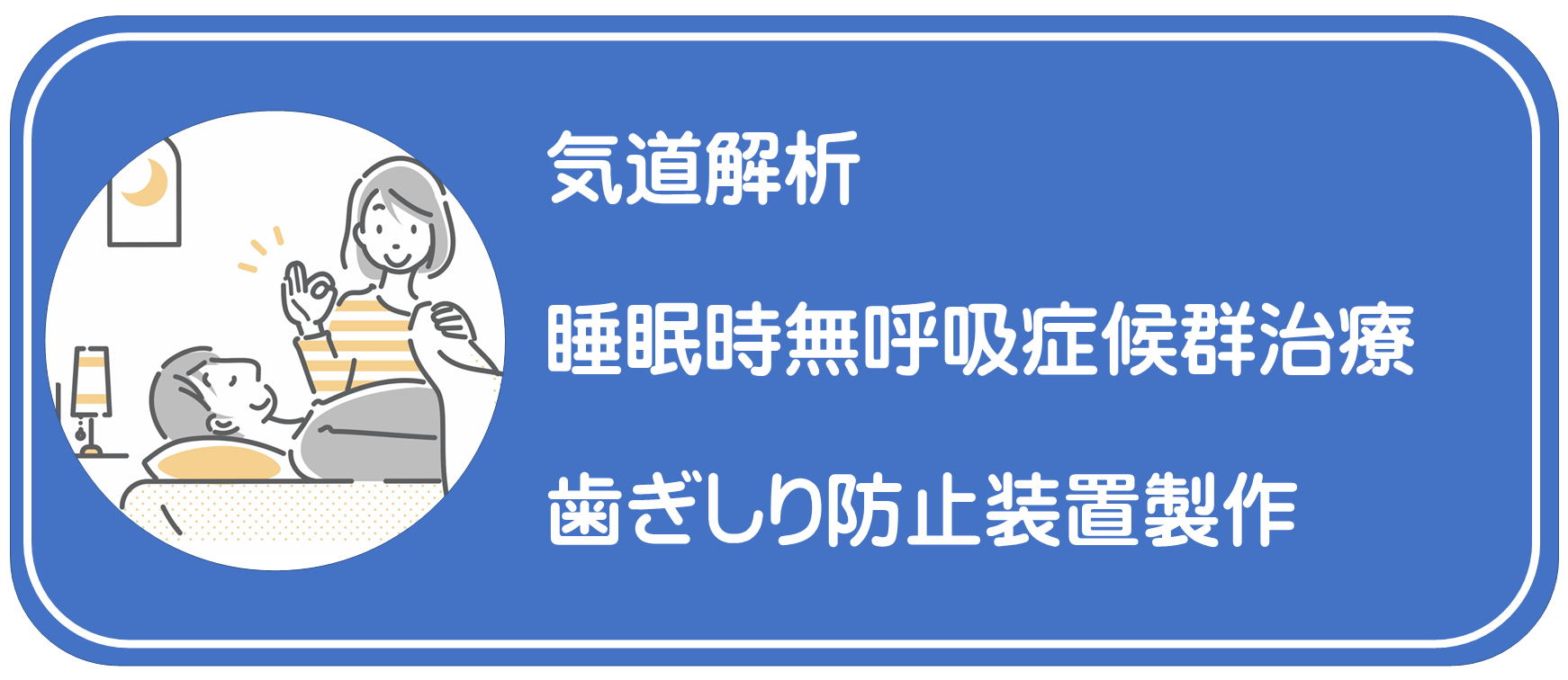 睡眠と歯科 ●睡眠時無呼吸症候群 睡眠時無呼吸症候群は、睡眠中に呼吸が止まる、または浅くなる病気です。 高血圧、脳卒中、心筋梗塞などを引き起こす危険性が約3~4倍高くなるとされています。 また、日中の眠気から作業骨率の低下、 居眠り運転や労働災害の原因に関与します。 国内に約500万人の罹患者がいるとされていますが、実際に治療を受けている患者さんは、10%と、早期発見が困難な疾患です。 当院が導入した歯科用CTは、広範囲を低侵襲で撮影でき、気道形態を解析、その閉塞を検知できます。 当院と連携している内科を紹介させていただき、睡眠時無呼吸の診断がされた場合、必要に応じ、気道を確保するための装置を製作します。 |