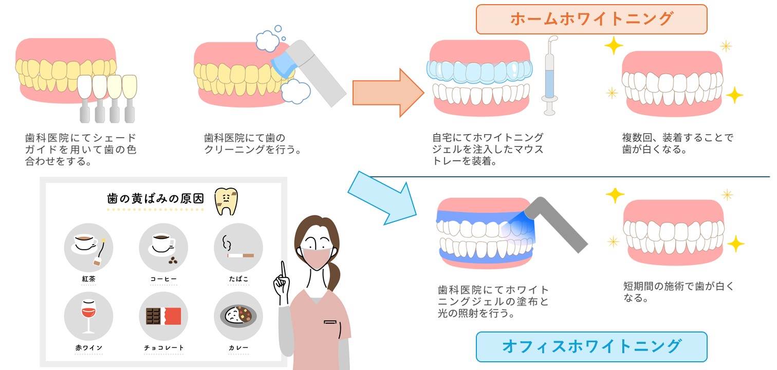 | ●ホワイトニング 薬剤を用いて、歯の表面を白くしていく治療です。 お家で行う方法(ホームホワイトニング)と歯科医院で行う方法(オフィスホワイトニング)に2パターンがあります。 |